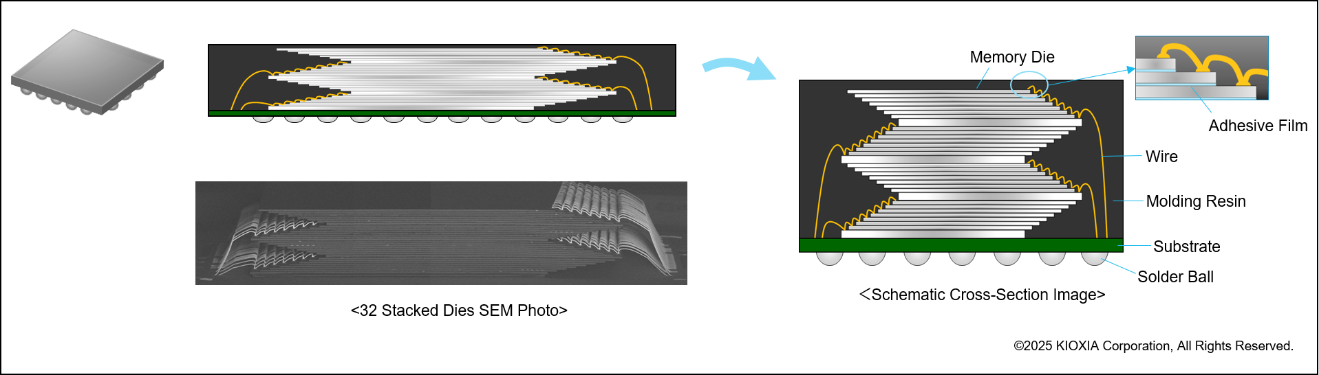 AI的飞速发展加速了对闪存容量的需求。铠侠将32个2Tb的闪存芯片集成于高度小于2mm的封装中,成功研发出容量高达8TB的闪存。我们采用晶圆减薄等先进的后端工艺,成功实现了这一存储器解决方案。