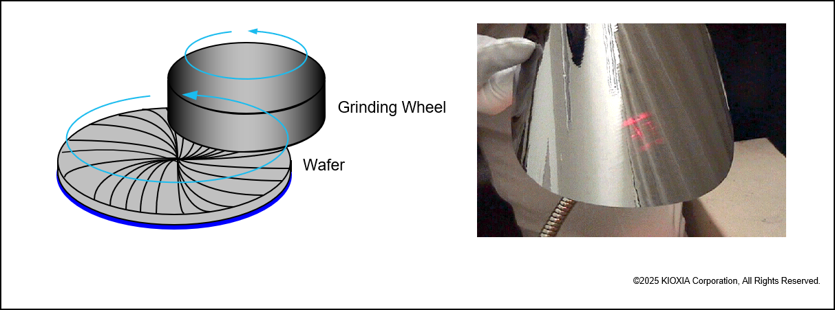 铠侠将300mm晶圆的厚度从0.8mm研磨至30-40μm,使晶圆厚度精度控制在0.1μm。要理解该工艺的精细程度,不妨想象一下,将一个滑冰场(60 x 30m)大小的巨大冰块均匀研磨至仅5mm的厚度,且厚度公差不超过0.5mm。