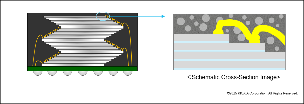 第三项关键技术是引线键合。芯片以阶梯式偏移层层堆叠,为引线键合留出空间。部分芯片形成了屋檐状的悬伸结构,在引线键合的压力下极易弯曲。因此,引线键合工艺必须进行极为精准的应力控制,以防止芯片因受力过大而破裂。铠侠不断研发满足这些要求的规范,并将其融入制造工艺之中。“引线键合的关键在于,我们必须逐步控制应力以防止裂纹的产生,必须在极短的键合时间内完成极其精密的调整。而实现这种精密控制的技术,正是铠侠的优势之一,也是我们先进封装技术的基础,”田窪知章先生强调。