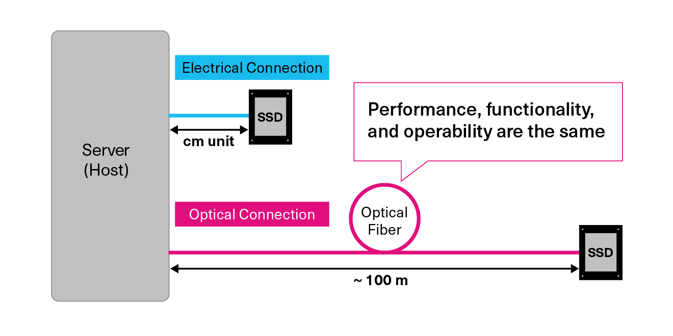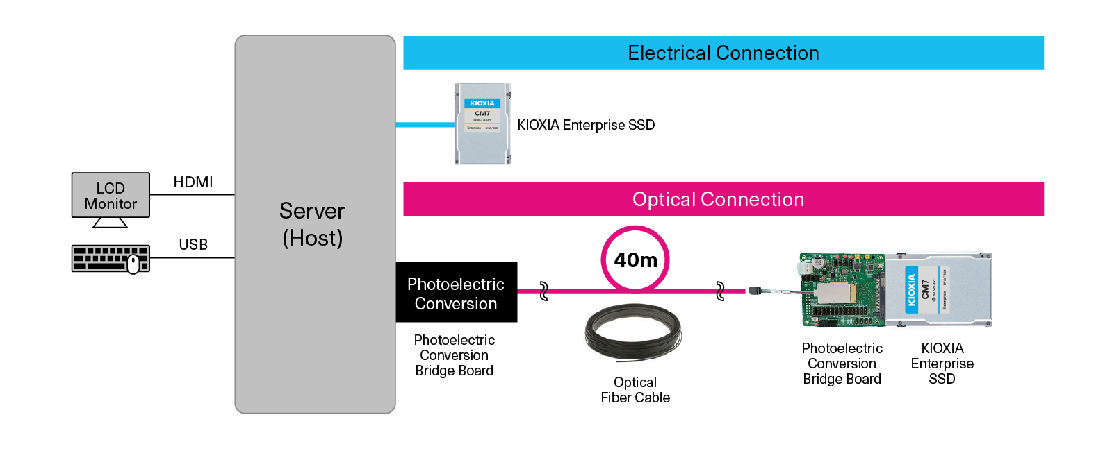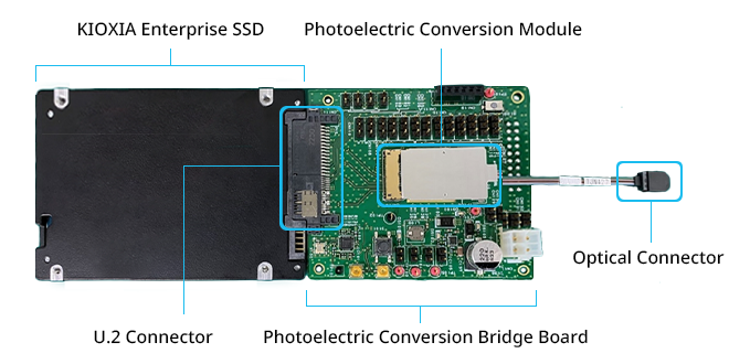通过研发光电转换桥接板并将其与铠侠的企业级 SSD 连接,实现采用光学接口的 SSD。