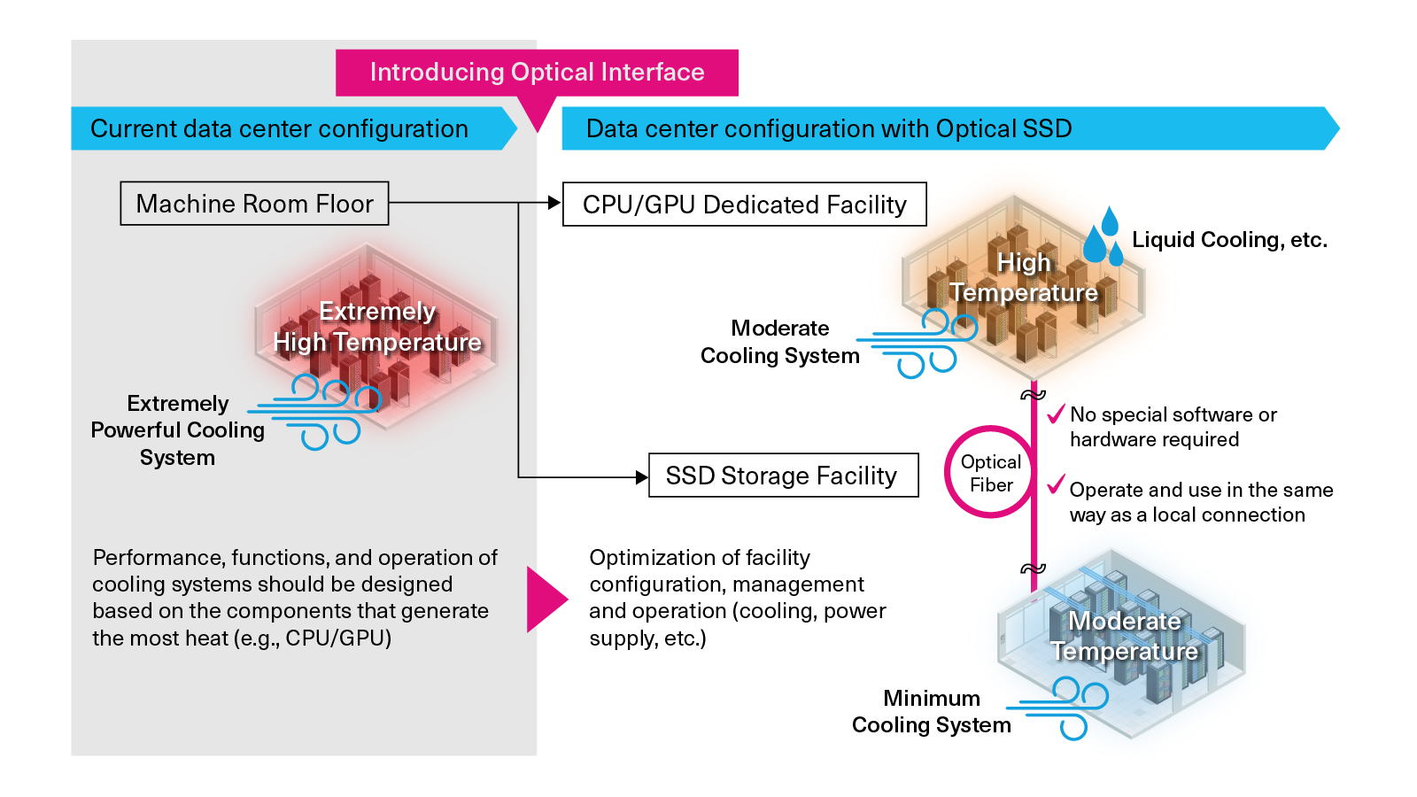 如今,信息在个人生活和商业领域中都发挥着至关重要的作用。对企业而言,信息是一项直接关系到成功与长久发展的关键资产。绝大多数信息都以数据的形式,存储于数据中心或企业本地服务器的 SSD 或其他存储设备上。尽管目前数据发送、接收和存储仍主要依赖于电气连接,但采用光连接的趋势正日益增长。铠侠正通过重点研发宽带光学 SSD,积极推动光技术的发展。