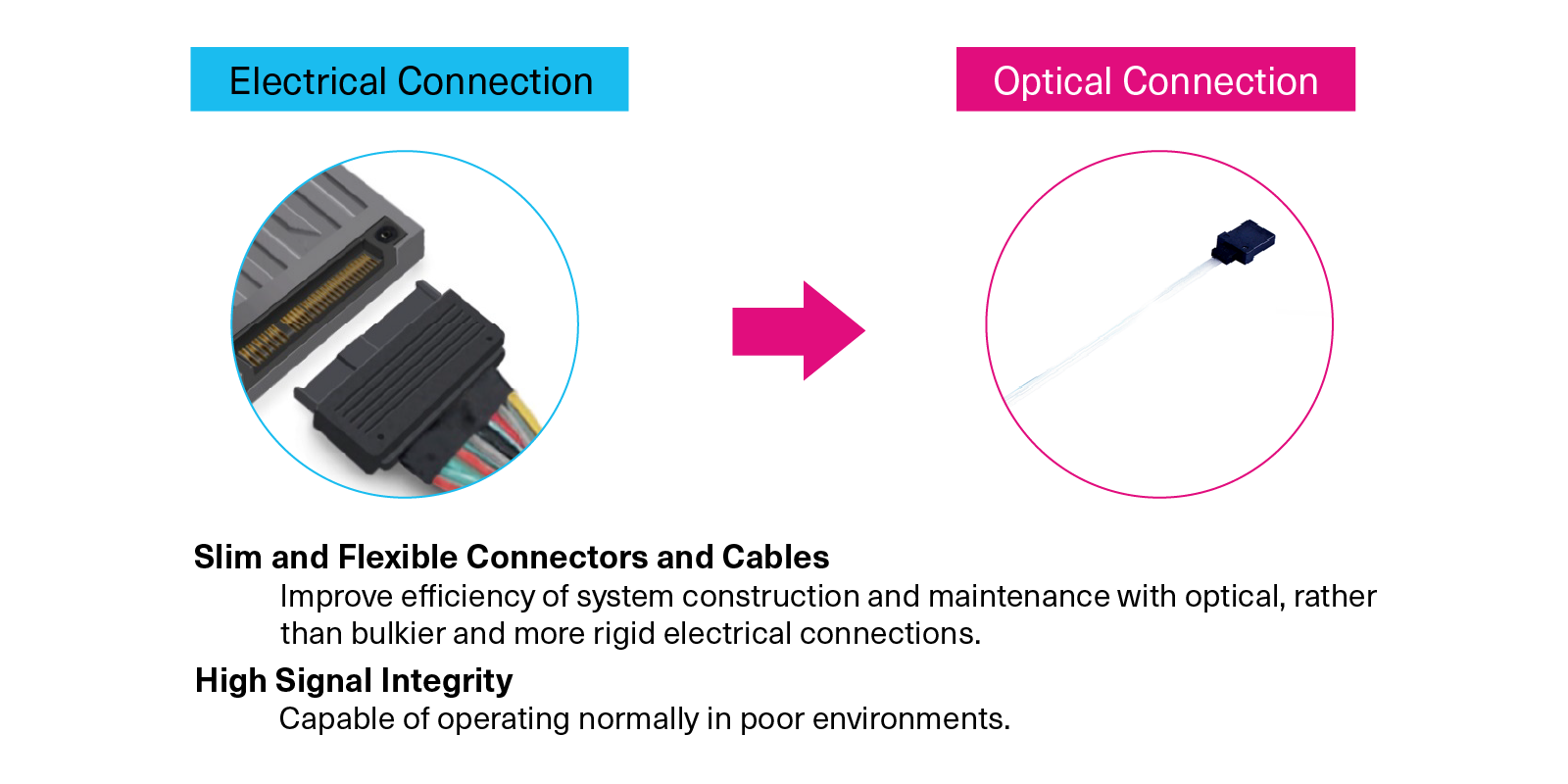 光缆不仅提供与电缆相同的带宽,还具有更为纤细、柔韧的接口和线材。相较于笨重、僵硬的传统电缆(线束),光缆大大提高了系统构建与维护的简便性和效率。此外,光缆消除了电缆常见的信号噪声干扰,能够适应太空或工厂等极具挑战性的运行环境。