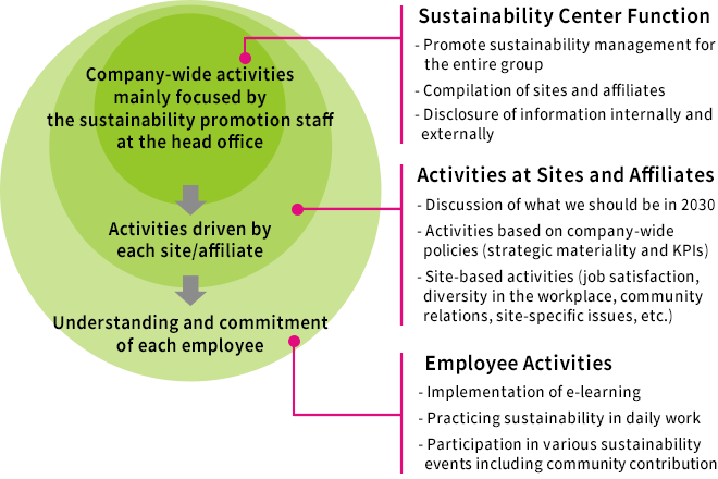 下面是这一理念的示意图 铠侠集团的活动主要分为“可持续发展核心职能”与“员工活动”两部分。为了有效衔接这两个环节,我们于2023财年在日本的三个主要生产基地(四日市工厂、横滨技术园区以及铠侠岩手株式会社)启动了“生产基地及关联公司活动”。借此,我们构建了一套内部体系,旨在将全公司推行的可持续发展方针与理念,切实传递给每一位员工。